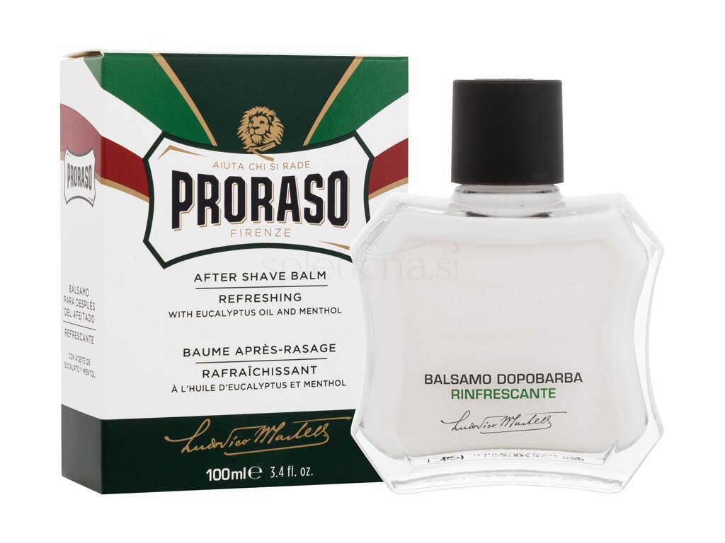 PRORASO Green After Shave Balm s klasičnim vonjem evkaliptusa in mentola ustvarja takojšnje olajšanje in prijeten občutek svežine, ki zaključi obred britja. Ta nemastna formula brez alkohola bo osvežila in tonirala kožo po britju. Hladilni mentol bo pomiril kožo, vonj evkaliptusa pa očistil ter ustvari takojšnjo olajšanje po britju. Kožo bo pustil tonirano, osveženo in navlaženo. Balzam in je brez parabenov, sulfatov, mineralnih olj, ftalatov in ne vsebuje silikonov in umetnih barvil.