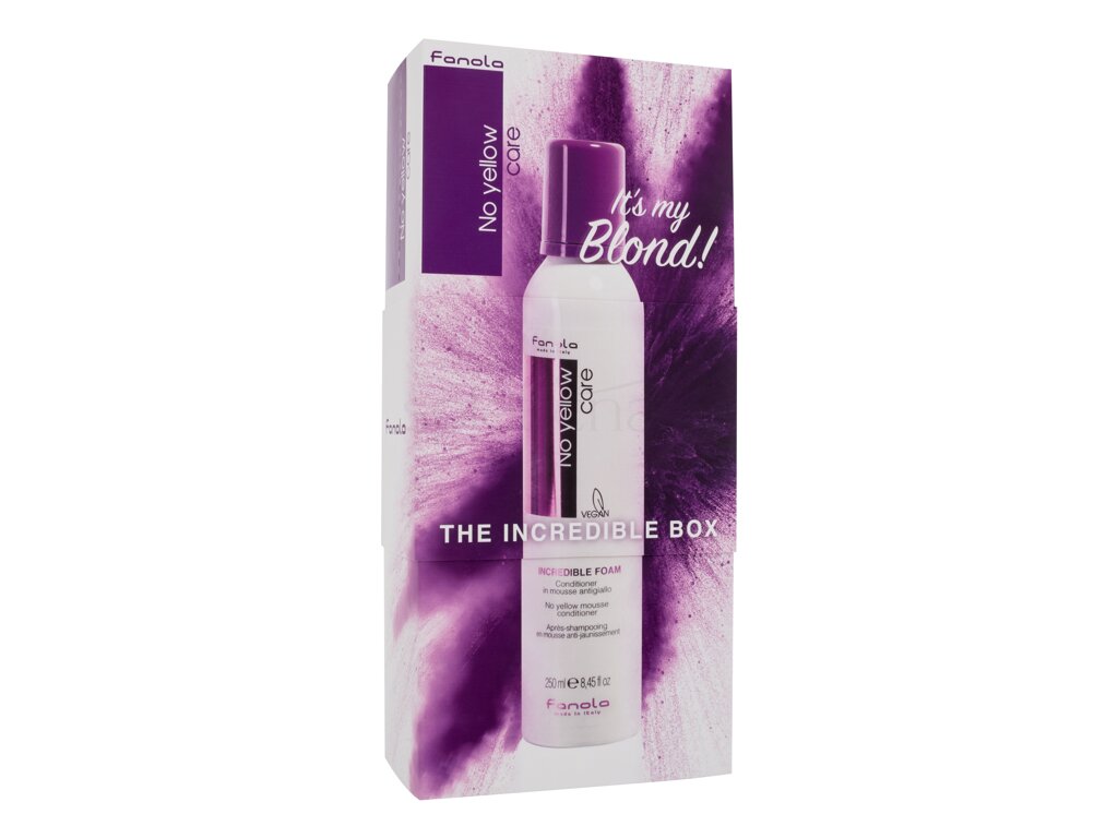Fanola No Yellow Incredible Foam balzam v peni odlično dopolnjuje linijo Fanola No Yellow za svetle lase in zagotavlja odličen barvni rezultat ter intenzivno nego las. Balzam je v obliki lahke pene, ki je primerna tudi za izjemno tanke lase, ki jih ne obteži in jim nudi vso potrebno nego. Vijolični pigmenti poskrbijo za zmanjšanje nezaželene rumene blond barve in lasem dodajo platinasto hladen svetli ton.