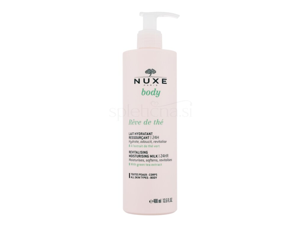 NUXE Rêve de Thé Revitalising Moisturising Milk je dišeč losjon za telo, ki koži zagotavlja dolgotrajno vlaženje. Tekstura je lahka in se hitro vpije ter po nanosu sprosti prijeten vonj. Formula, ki vsebuje 98 % sestavin naravnega izvora, je veganska in primerna za vse tipe kože.