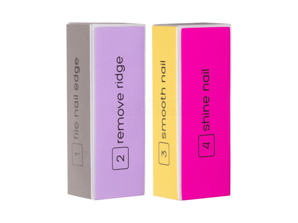 S pomočjo grobe pilice (številka 1) prilagodite obliko in robove nohta. Nadaljujte z odstranjevanjem neravnih površini nohtov (številka 2) in zgladite (številka 3). Končajte s poliranjem nohta (številka 4).
