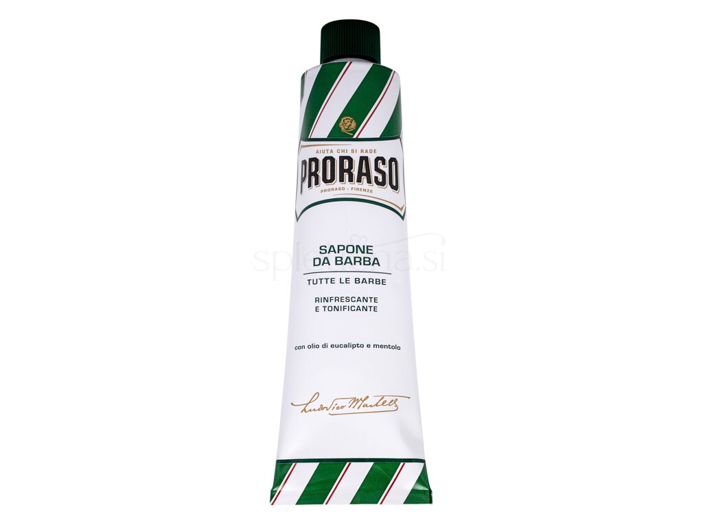 PRORASO Green Shaving Soap In A Tube zagotavlja bogato, kremasto plast pene za gladko britje. Posebna formula učinkovito mehča in pomirja suho kožo. Dodano metino in evkaliptusovo olje ohranjata kožo elastično, jo pomirjata ter negujeta sveže obrito kožo in jo na koncu izdatno odišavita. Dodan glicerin omogoča britvici bolj gladko drsenje.