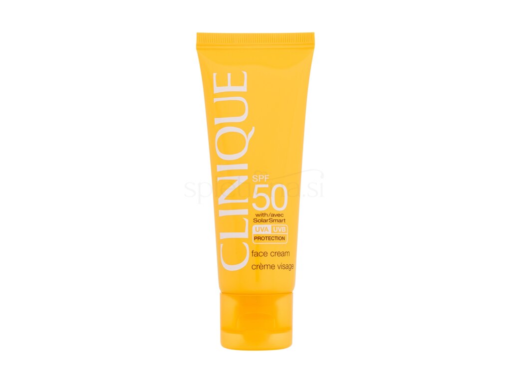 Clinique Sun Face Cream SPF50 je žametna formula s tehnologijo SolarSmart, ki zagotavlja zaščito pred soncem in obnavljanje brez olja. Mešanica mineralnih in tradicionalnih UVA/UVB filtrov ter tehnologija SolarSmart ščiti kožo pred poškodbami sonca, ki lahko povzročijo linije in gube .