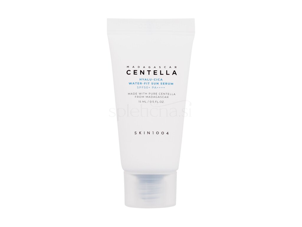 SKIN1004 Hyalu-Cica Water-Fit Sun Serum SPF50+ je non-nano kemična krema v obliki seruma za zaščito pred soncem, ki blokira UV žarke, hkrati pa vlaži kožo. Pusti kožo z navlaženim, rožnatim zaključkom.