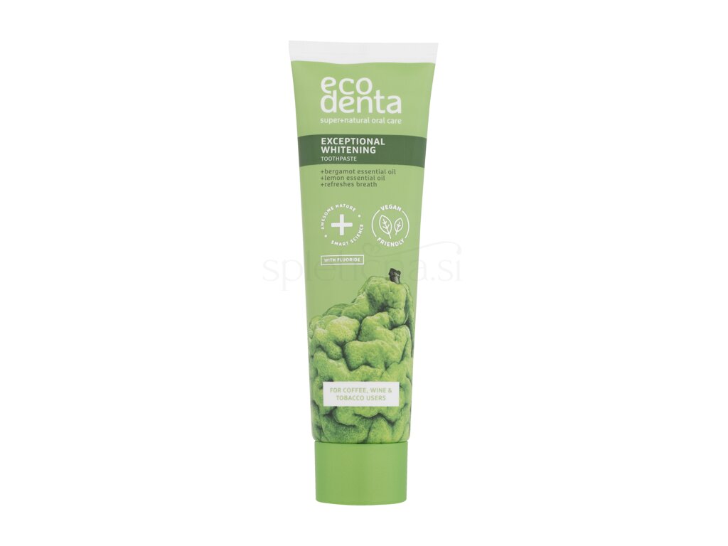 Ecodenta Exceptional Whitening Toothpaste Anti Coffee & Tobacco je zobna pasta, ki se bori proti madežem obarvanih pijač in tobaka. Zobe pomaga ohranjati bele, ne da bi pri tem poškodovala sklenino. Zobna pasta vsebuje veliko količino naravnih sestavin: limonino olje, ki pomaga odstraniti rumene madeže na zobeh in bergamotovo olje, ki daje zobni paste svež okus citrusov in zagotavlja svež dah.